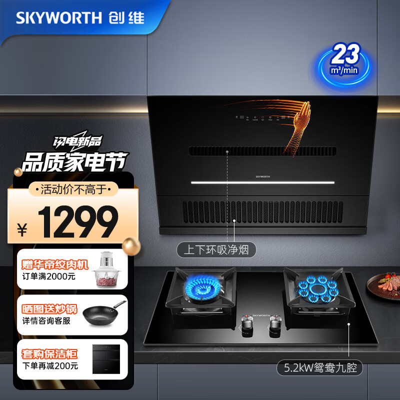 创维(Skyworth)油烟机 顶侧双吸烟灶套装 家用抽油烟机23风量自动清洗油烟机燃气灶具套装 Y3J+Z61BS天然气价格:1299.00元!