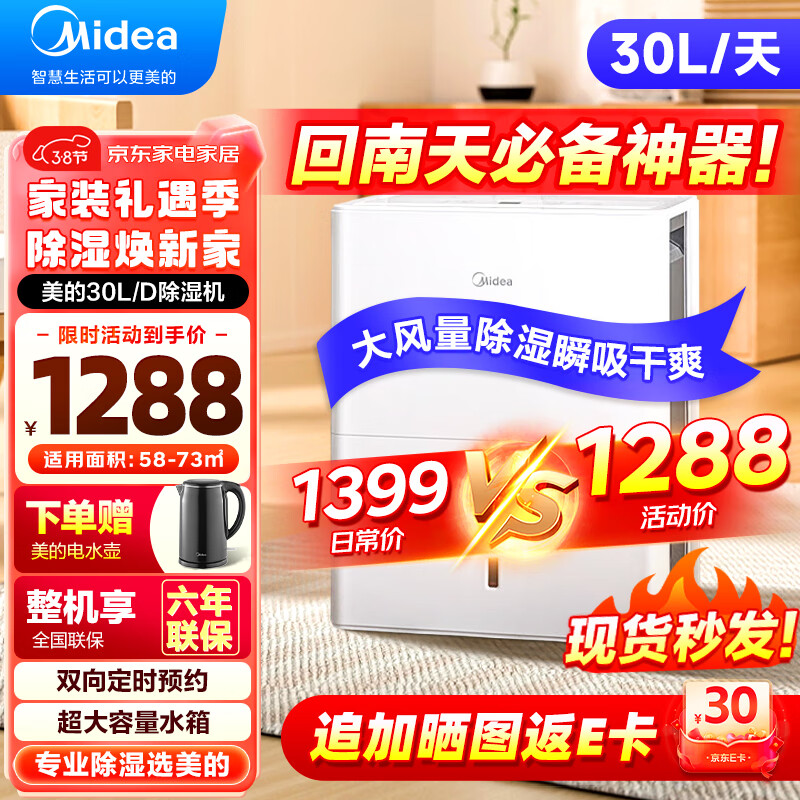 美的(Midea)除湿机/抽湿机 家用抽湿器 30升/天 卧室客厅干衣去湿 地下室吸湿器除湿器 智能控湿CF30BD/N7-DP5价格:1288.00元!