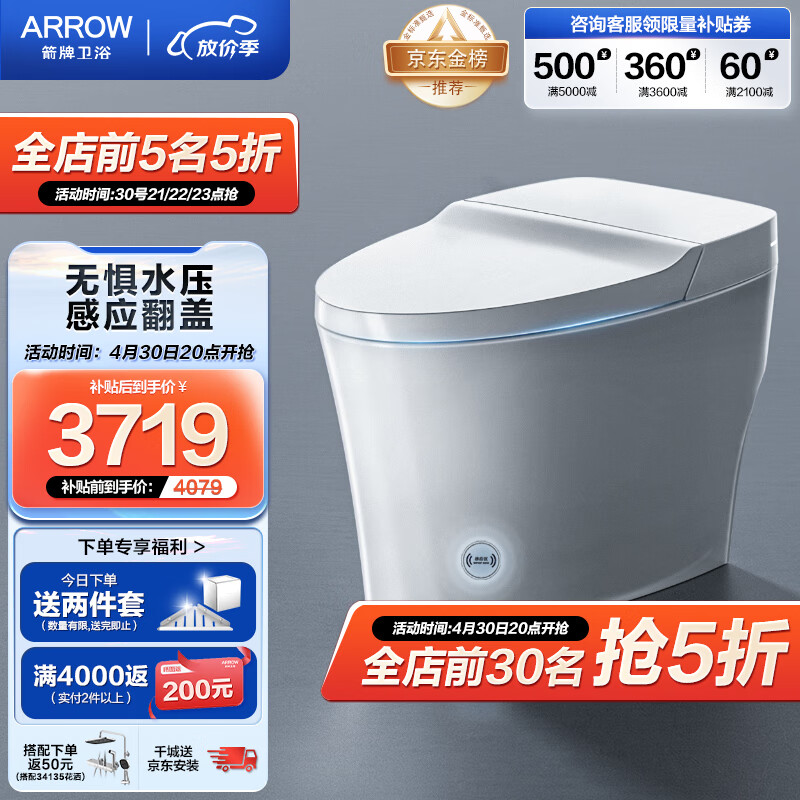 箭牌(ARROW)智能马桶恒温座圈按摩加热坐便器 无水压脚感翻盖翻圈AKE1135L价格:4529.00元!