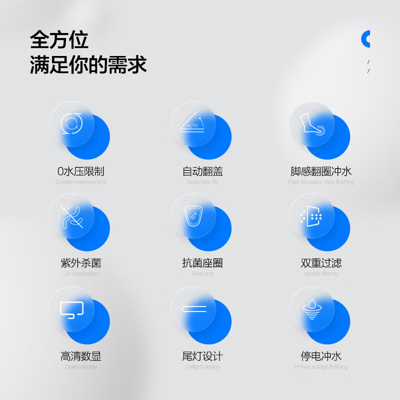 功能:暖风烘干,按摩清洗,臀部清洁,座圈加热,喷嘴自洁,女性清洗,喷嘴移动清洗,记忆功能,水温调节,水压调节,感应翻盖,坐温调节,感应翻圈,柔和夜灯