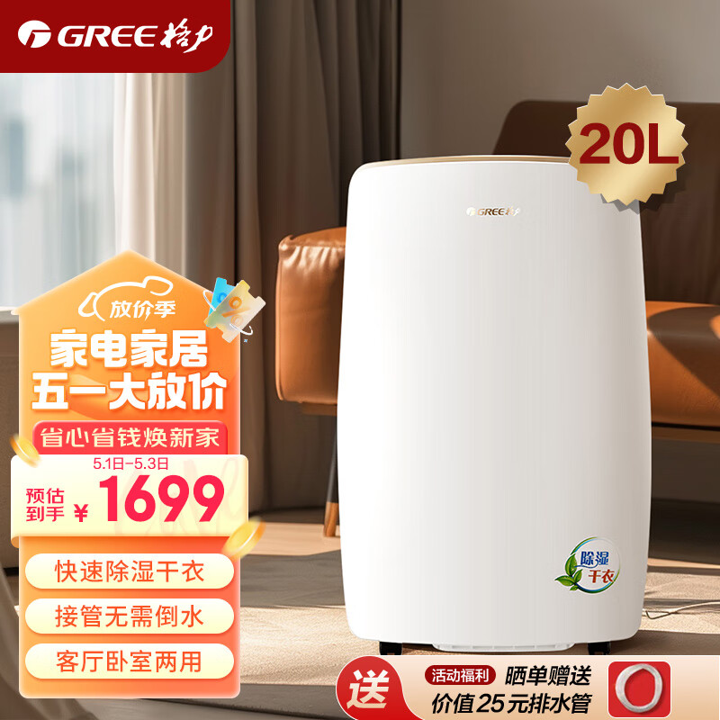 格力(GREE)抽湿机/除湿机 除湿量20升/天 家用轻音卧室办公室地下室干衣除湿器 智能数控(DH20EH)价格:1998.00元!