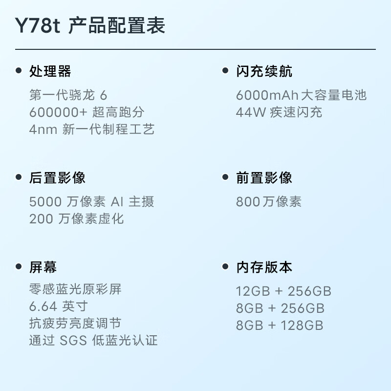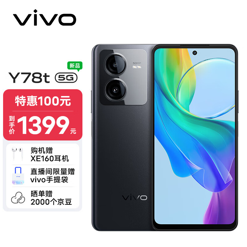 vivo Y78t 12GB+256GB 月影黑 4nm代骁龙6 6000mAh大电池 5000万超清影像 5G 快充 拍照 手机价格:1499.00元!