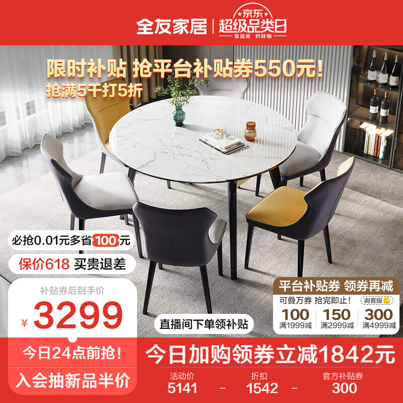 全友家居 现代轻奢岩板餐桌椅餐厅家具可方可圆伸缩折叠餐桌DW1059价格:5141.43元!