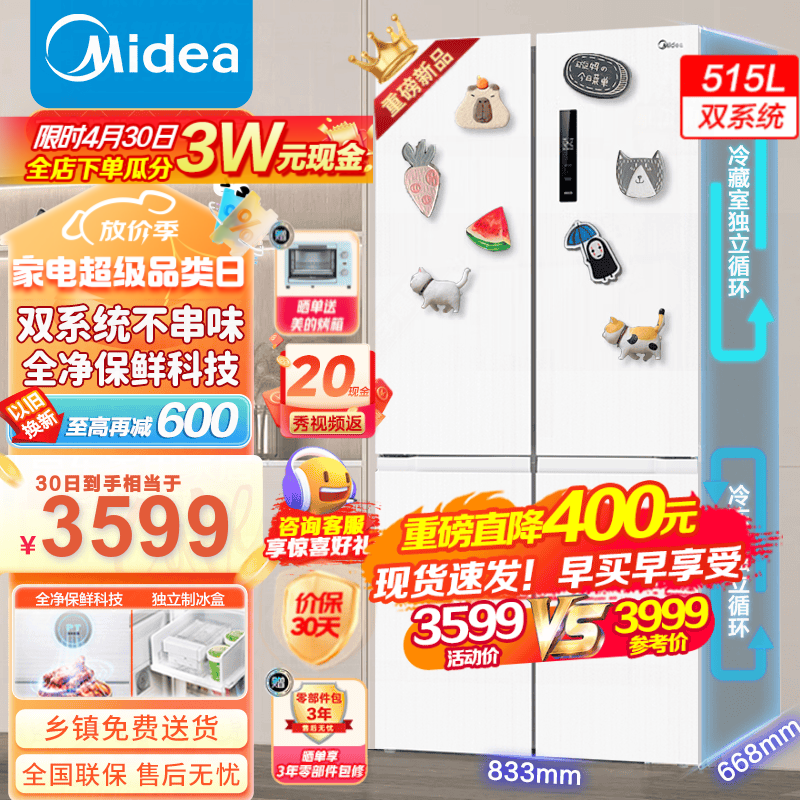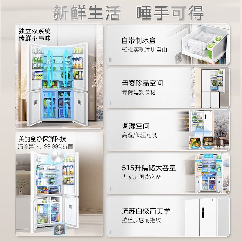美的(Midea)540十字四开门对开门变频一级能效双系统双循环大容量净味风冷无霜独立制冰盒智能冰箱 MR-540WSPZE价格:3999.00元!