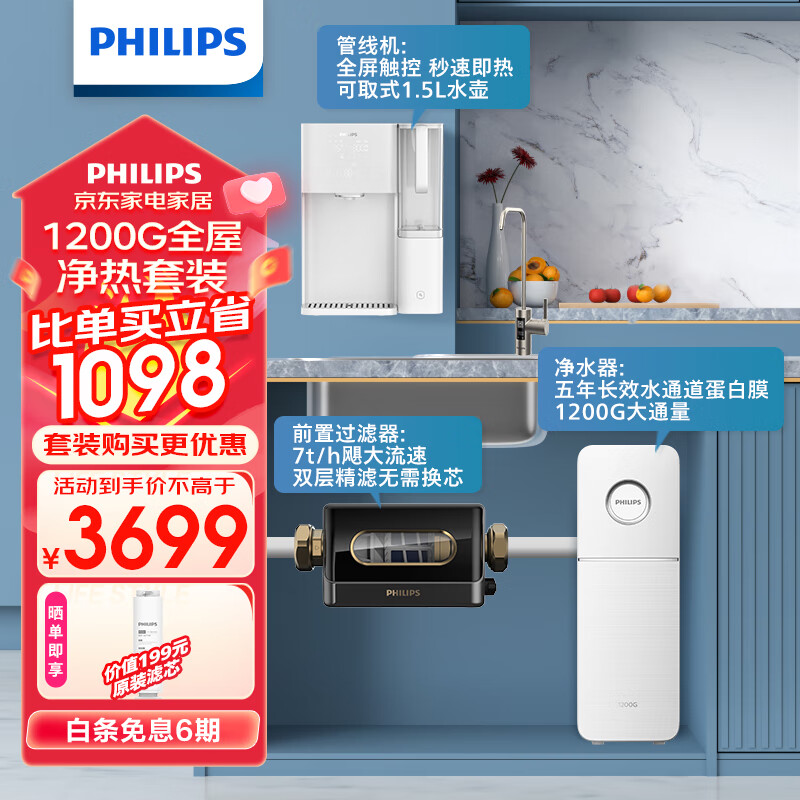 飞利浦(PHILIPS)家用净水器全自动冲洗前置管线机加热净水器套装【引擎1200G+管线机ADD4826+前置过滤器AWP1880】价格:3699.00元!
