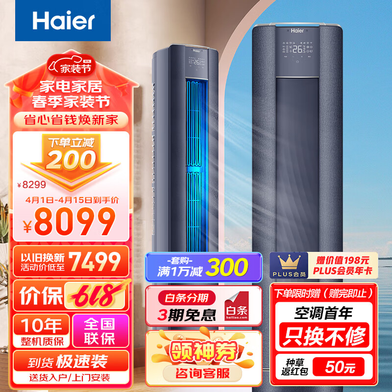 海尔(Haier)3匹 雷神者新一级变频省电客厅空调立式柜机 双极离子空气除菌 凉芯桥科技 定位送风 72LFA81价格:8099.00元!