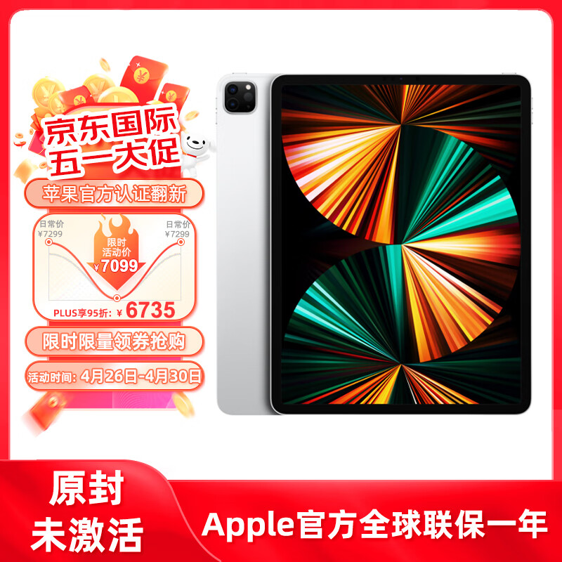 Apple iPad Pro12.9英寸(第5代)平板电脑 512G WiFi版 原封未激活 M1芯片 银色 苹果官方认证翻新价格:7299.00元!