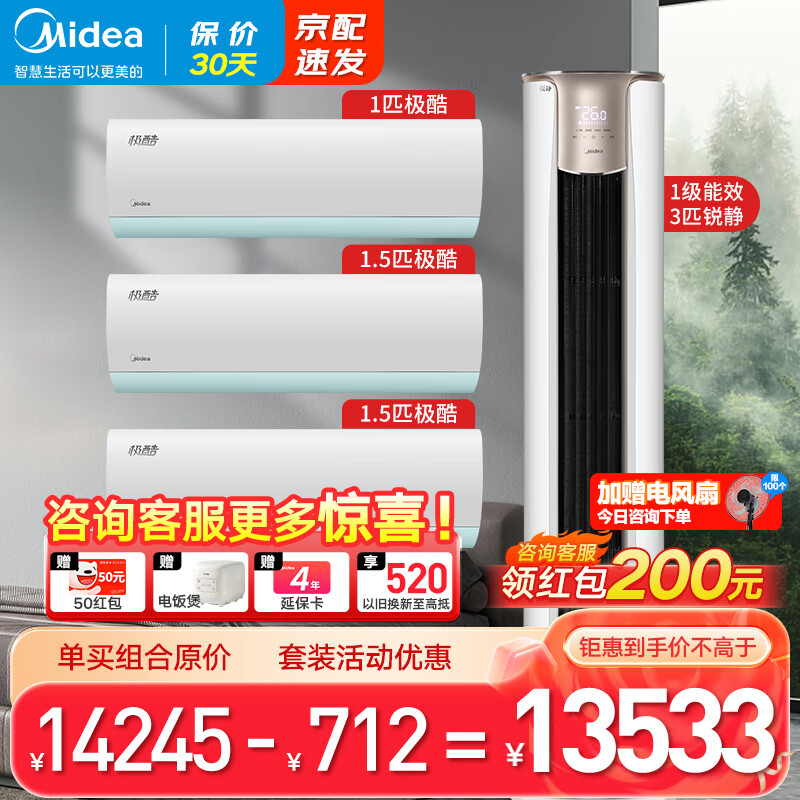 美的空调套装 新一级能效三室一厅套餐全直流变频冷暖 大出风口APP智控 极酷(1匹+1.5匹*2)+锐静3匹价格:13533.00元!