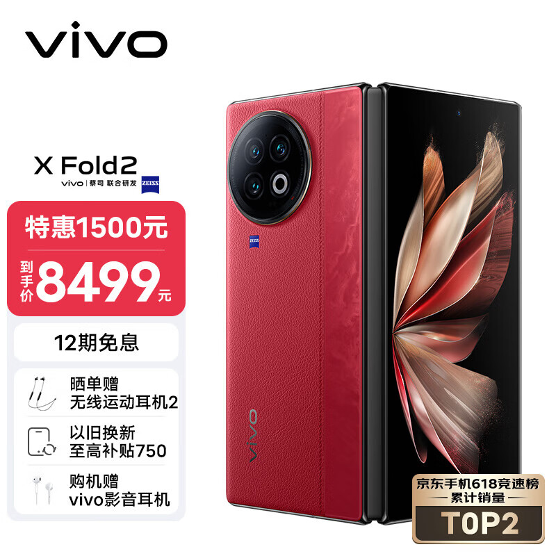 vivo X Fold2 12GB+512GB 华夏红 2K+ E6 120Hz折叠巨幕 120W双芯闪充 第二代骁龙8 5G 折叠屏手机 xfold2价格:8499.00元!
