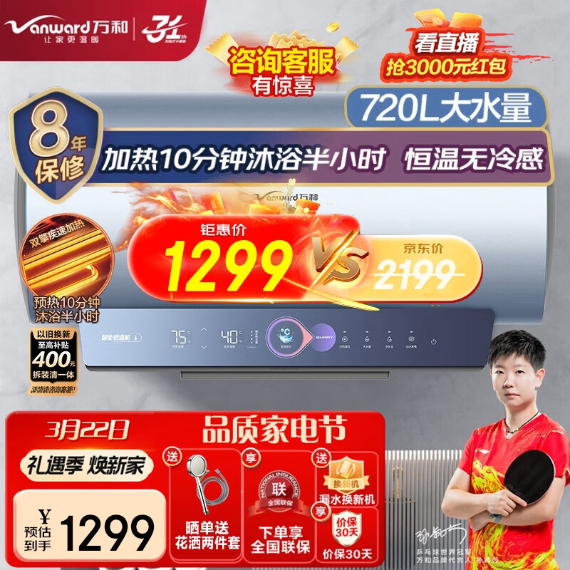 万和(Vanward)60升电热水器速热出水断电3300W【加热10分钟沐浴半小时】一级能效双恒温无冷感12倍增容R9D价格:1599.00元!