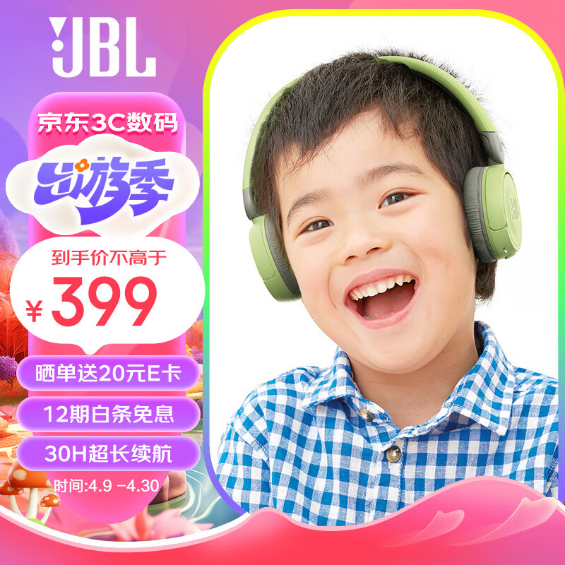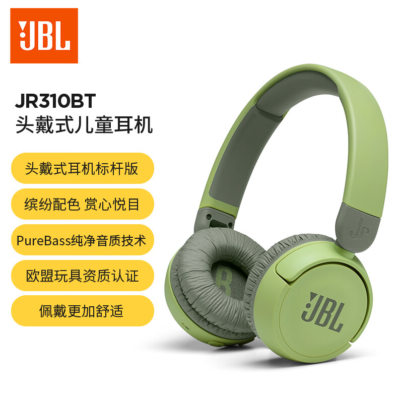 JBL JR310BT 头戴式无线蓝牙耳包耳机益智玩具沉浸式学习听音乐英语网课学生儿童耳机丰富色彩 深林绿价格:439.00元!