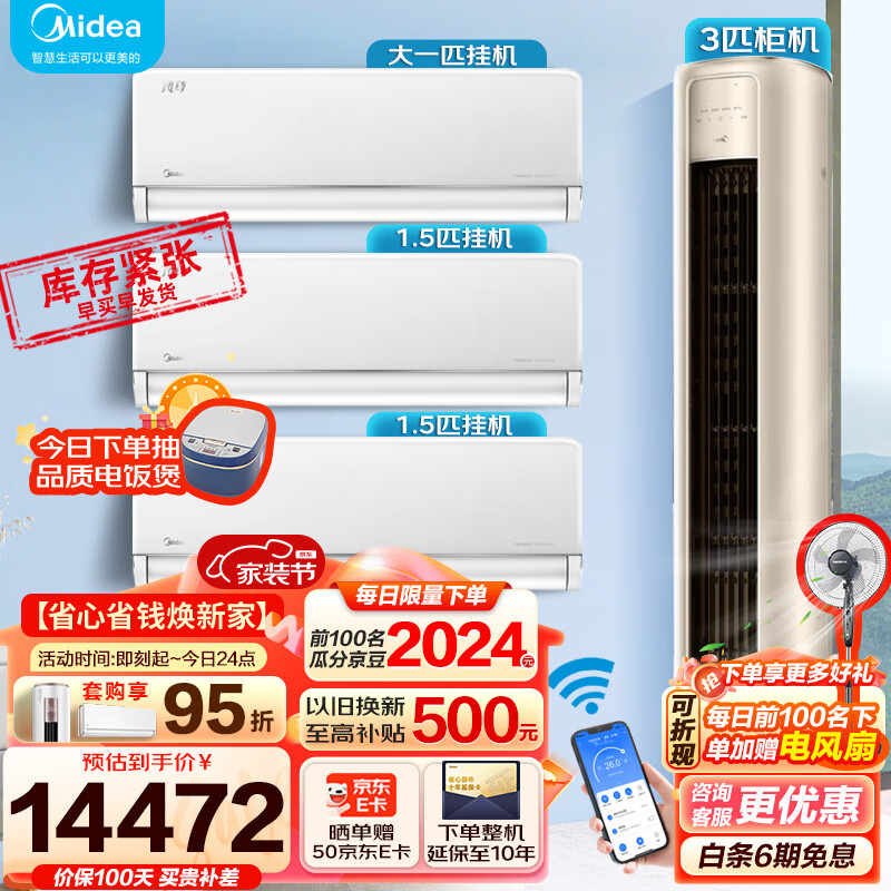 美的(Midea)空调套购 风尊系列 三室一厅 一级变频冷暖大出风口空调 3匹风尊+大1匹风尊+大1.5匹风尊(2台)价格:14472.00元!