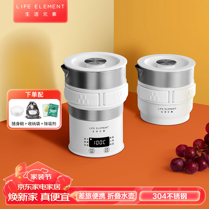 生活元素(LIFE ELEMENT)迷你不锈钢旅行折叠电水壶 便携式烧水壶 随身小火锅煮面电热锅0.5L一键加热款I65价格:239.00元!