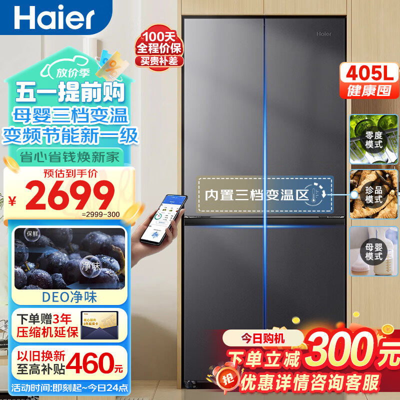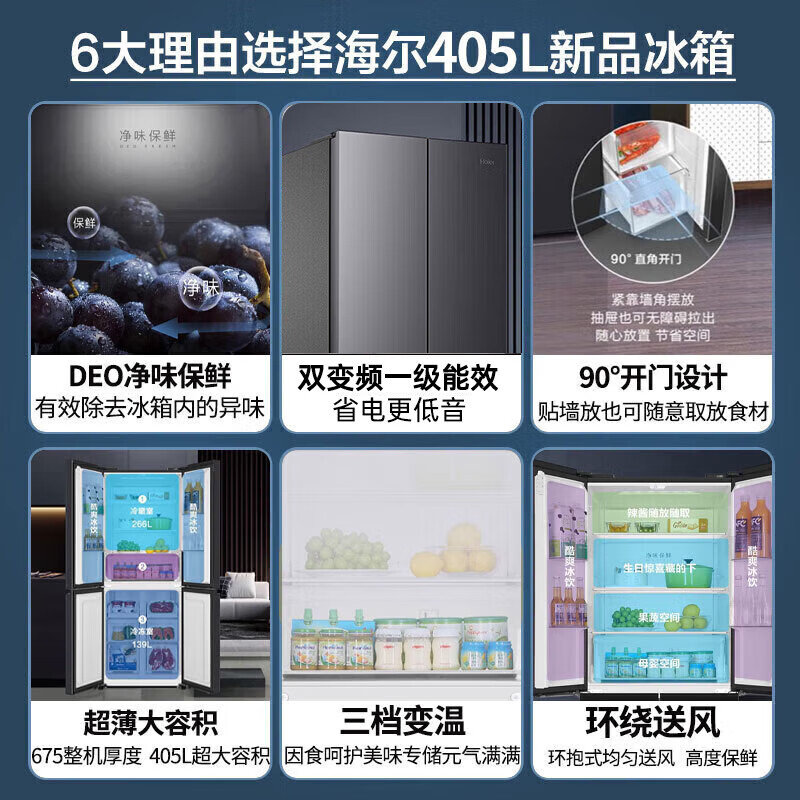 海尔(Haier)冰箱405升十字四门对开门超薄冰箱 风冷无霜家用母婴 一级能效双变频 WiFi智控三挡变温电冰箱价格:2699.00元!