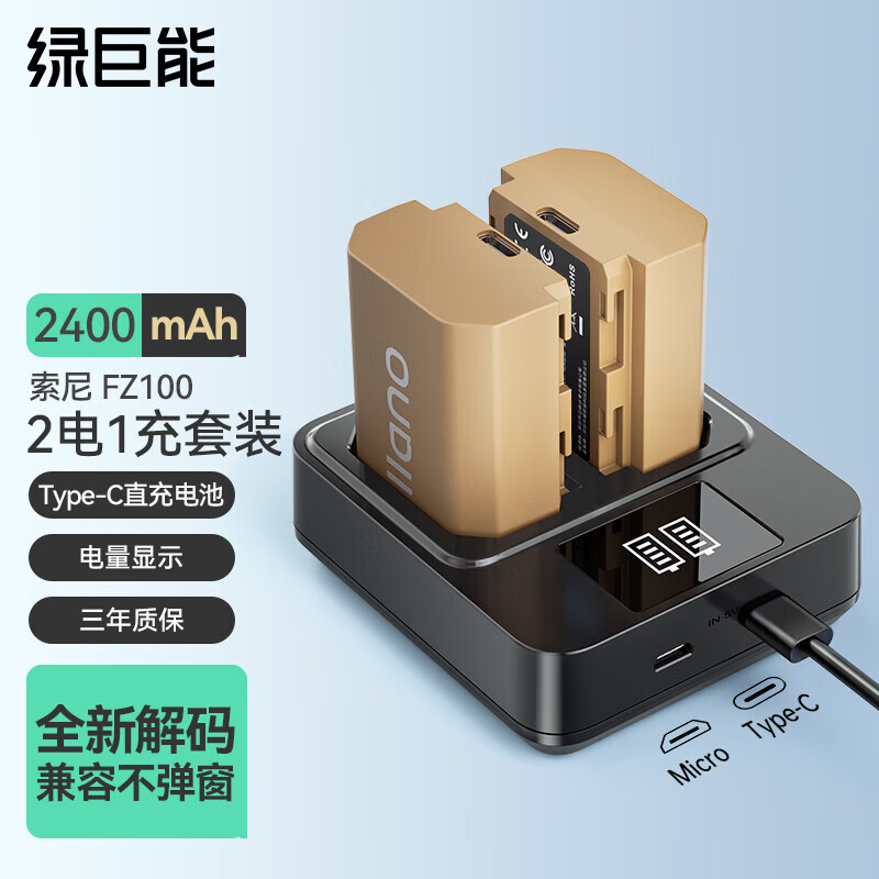 绿巨能(llano)索尼NP-FZ100电池a7m4相机电池A9 a7s3 a7c a7r3 a7m3 a6600微单Type-C口充电电池两电双充2400mAh价格:518.00元!