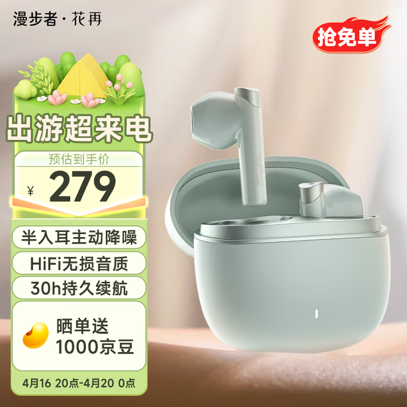 漫步者花再Magic ANC 真无线蓝牙耳机 半入耳主动降噪音乐运动游戏耳麦适用于安卓苹果华为小米手机 豆绿价格:299.00元!