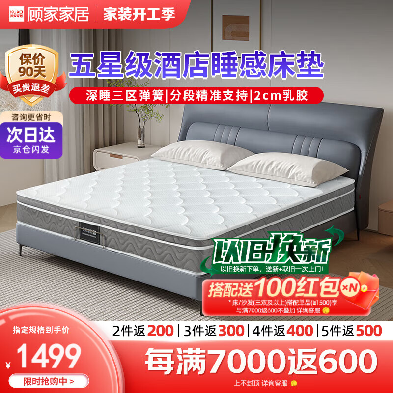 顾家家居 软硬两用床垫2cm天然乳胶三区整网独立弹簧席梦思1.8米 M1016价格:1498.00元!