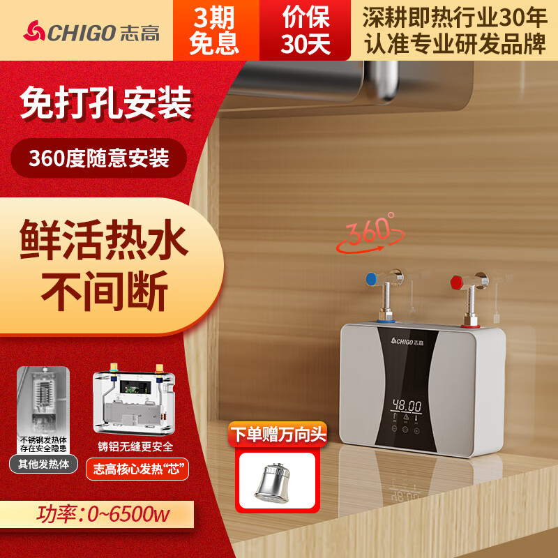 志高(CHIGO)即热式小厨宝电热水器 6500W厨房热水器集成免储水电热水龙头小型家用热水宝过水热ZG-KB630价格:328.00元!