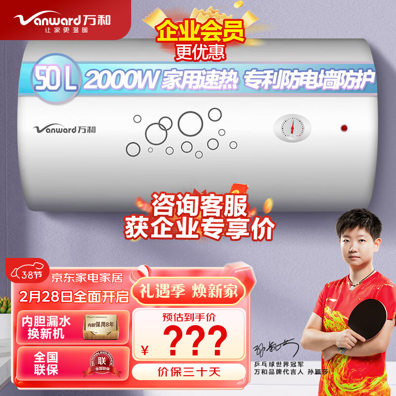 万和(Vanward)50升电热水器 恒温储水式 家用速热 小体积安装 双电盾防护 2000W经济节能 E50-Q1W1-22 企业专享价格:499.00元!