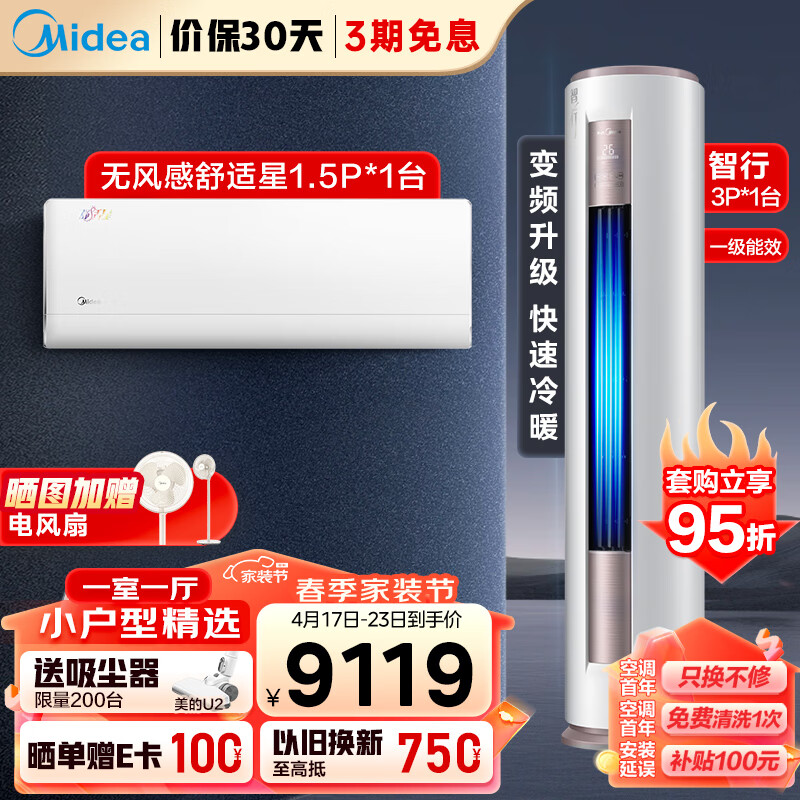 美的(Midea)空调套装 小户型精选 一室一厅(1.5匹舒适星一级挂机+3匹智行柜机一级)一套购齐价格:9598.00元!