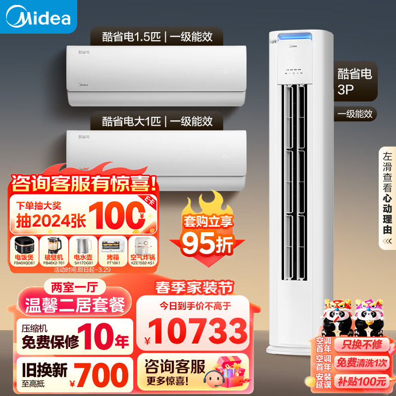 美的(Midea)空调 新一级能效 酷省电 空调套装 两室一厅 温馨二居套餐(大1匹+1.5匹+3匹)价格:11297.00元!
