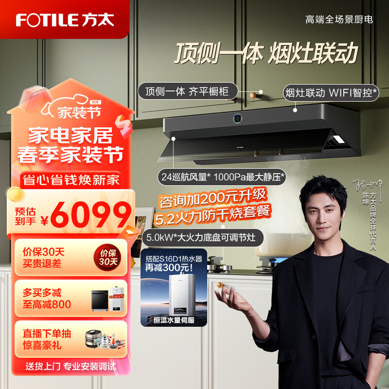 方太(FOTILE)F2抽吸油烟机灶具套装 顶侧一体欧式侧吸 齐平橱柜 变频24巡航风量烟灶联动套餐01-F2.i+THF1-G价格:6099.00元!