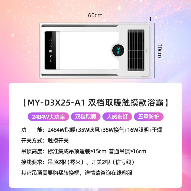 下面笔者为大家介绍美的MY-D3X25-A1,总体感觉还满意的,浴霸美观大方,双电机,风力挺大,制热也很快,灯也很亮,触摸开关有两根信号线,无需装电池,灵敏度不错,人体感应灯很贴心,挺满意。