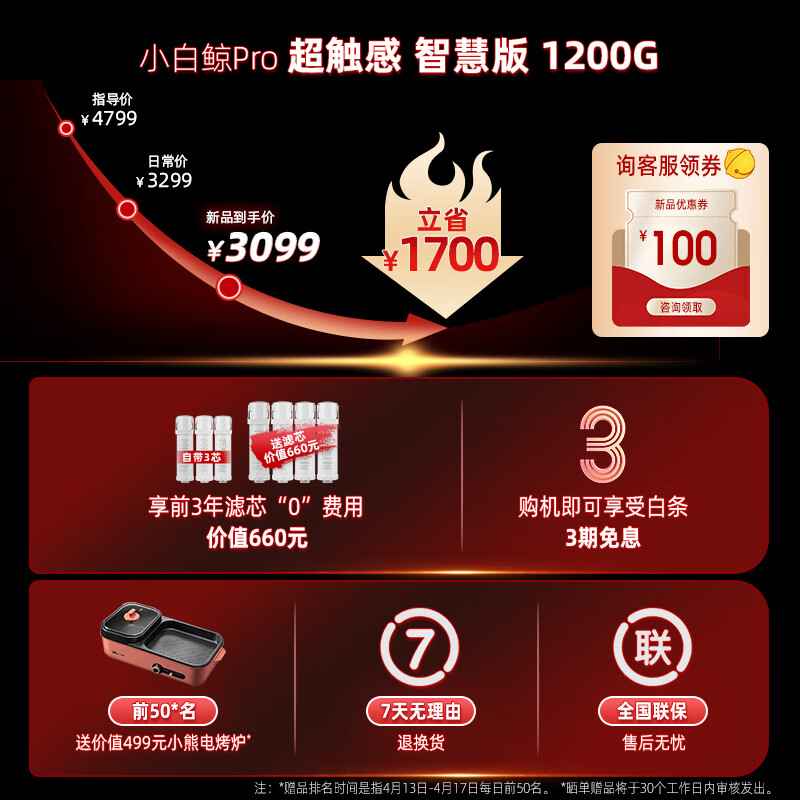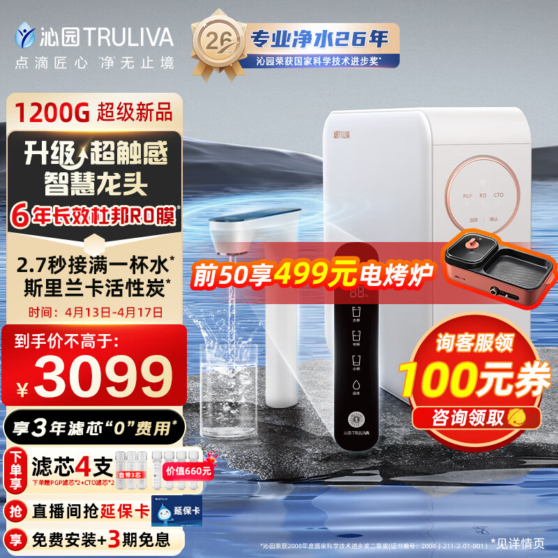 沁园(TRULIVA)触控屏 小白鲸PRO大通量1200G家用净水器 6年RO反渗透 厨下直饮3.3L/分钟UR-S51298价格:3099.00元!