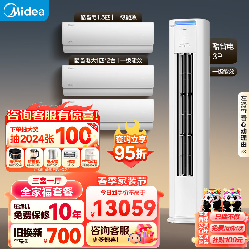 美的(Midea)空调 新一级能效 酷省电 空调套装 三室一厅 全家福套餐(大1匹*2+1.5匹+3匹)价格:13746.00元!