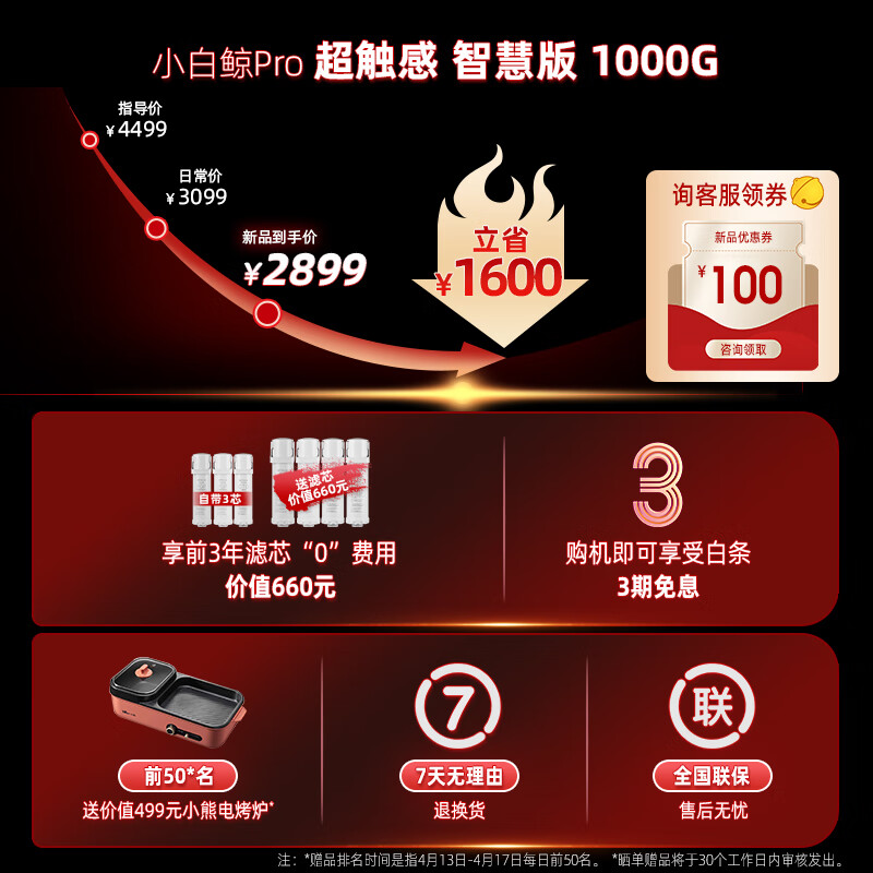 沁园(TRULIVA)触控屏 小白鲸PRO大通量1000G家用净水器 6年RO反渗透 厨下直饮3L/分钟UR-S51098价格:2899.00元!