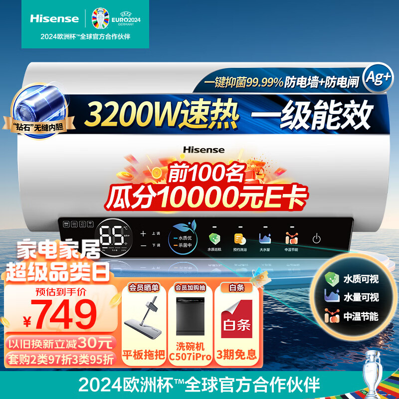 海信(Hisense)60升家用电热水器3200W大功率8倍增容无缝内胆一级能效双重防电保护WIFI智能ES60-C301i以旧换新价格:1299.00元!