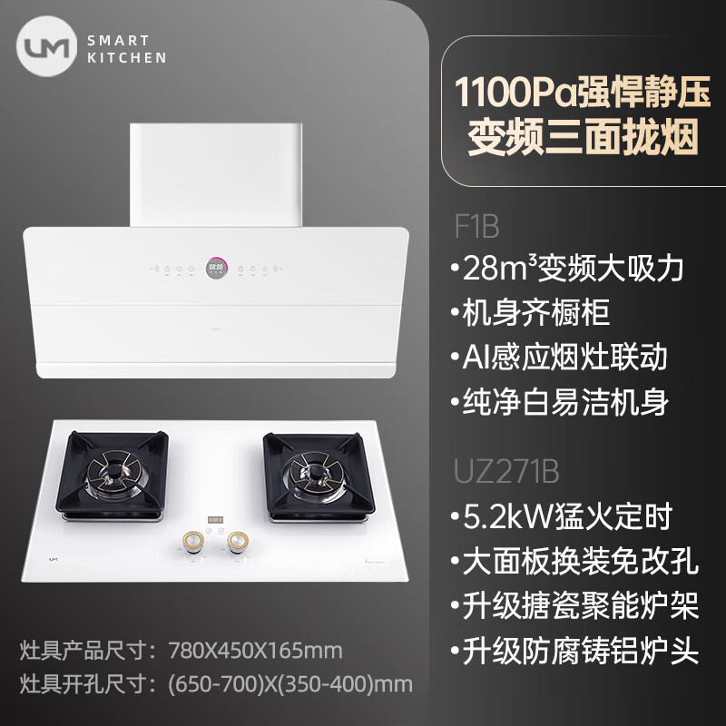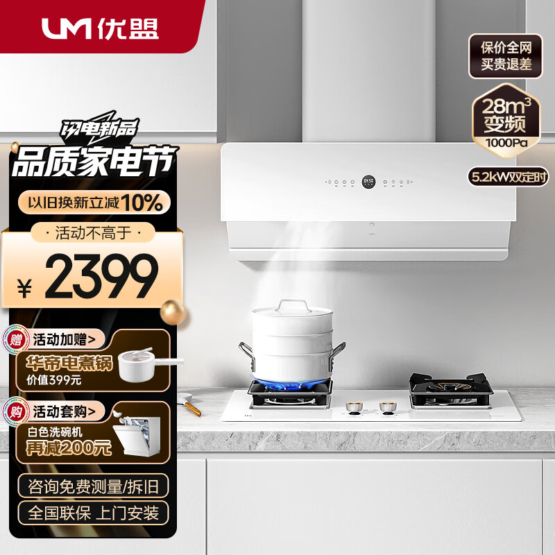 优盟(UM)直流变频抽油烟机灶具套装白色 家用大吸力侧吸式抽烟机燃气灶烟灶套装自动清洗 28风量 天然气价格:2399.00元!