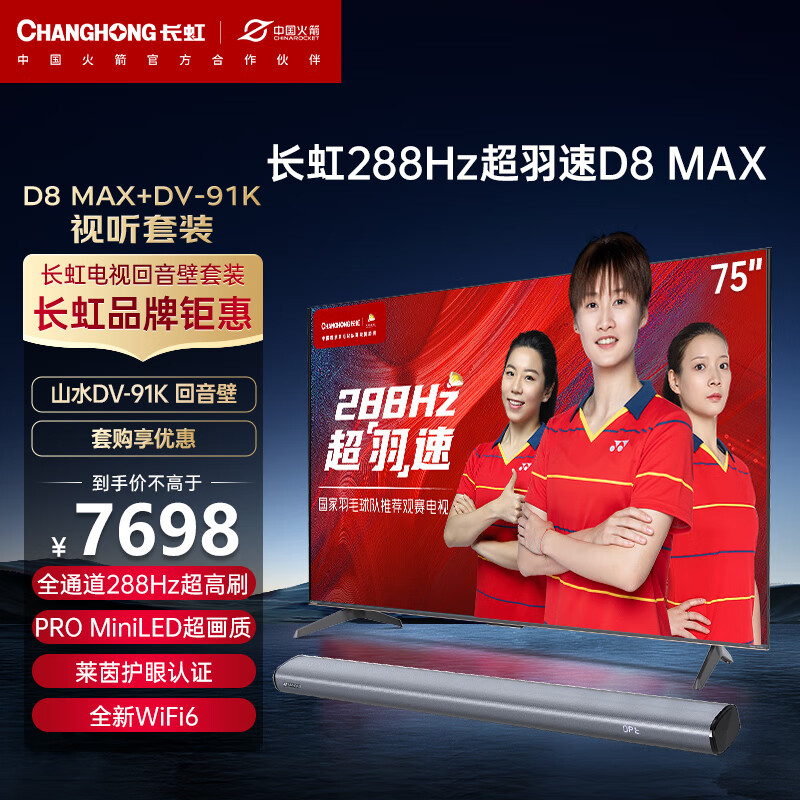 长虹电视75D8 MAX 75英寸288HzMiniLED游戏电视+山水DV-91K3D环绕低音炮价格:7649.00元!