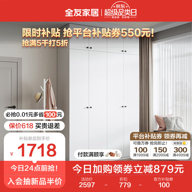 全友家居 衣柜简约风卧室衣物收纳纯色百搭多规格平开门家具DG10009价格:2597.14元!
