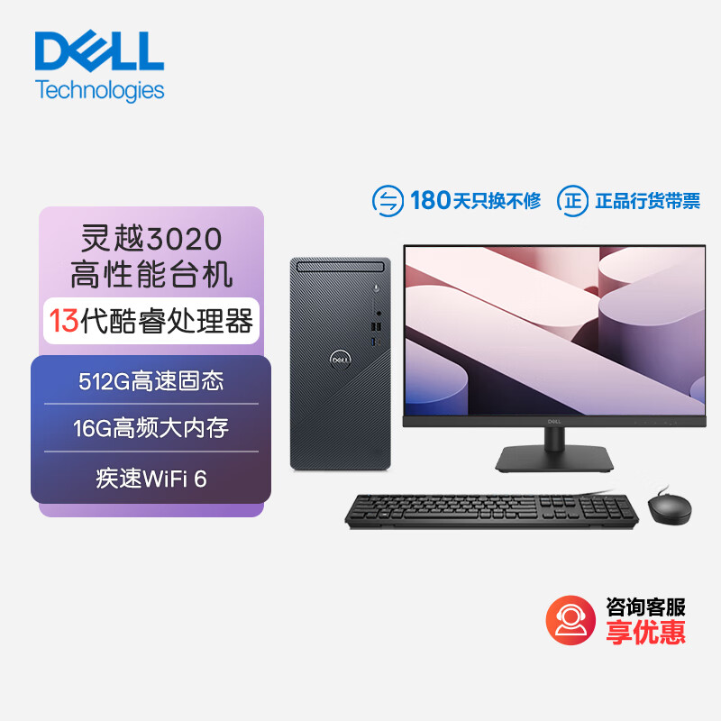 戴尔(DELL)灵越3020 台式电脑主机 (酷睿13代i5-13400 16G 512GSSD)23.8英寸大屏显示器 高性能CPU价格:4899.00元!