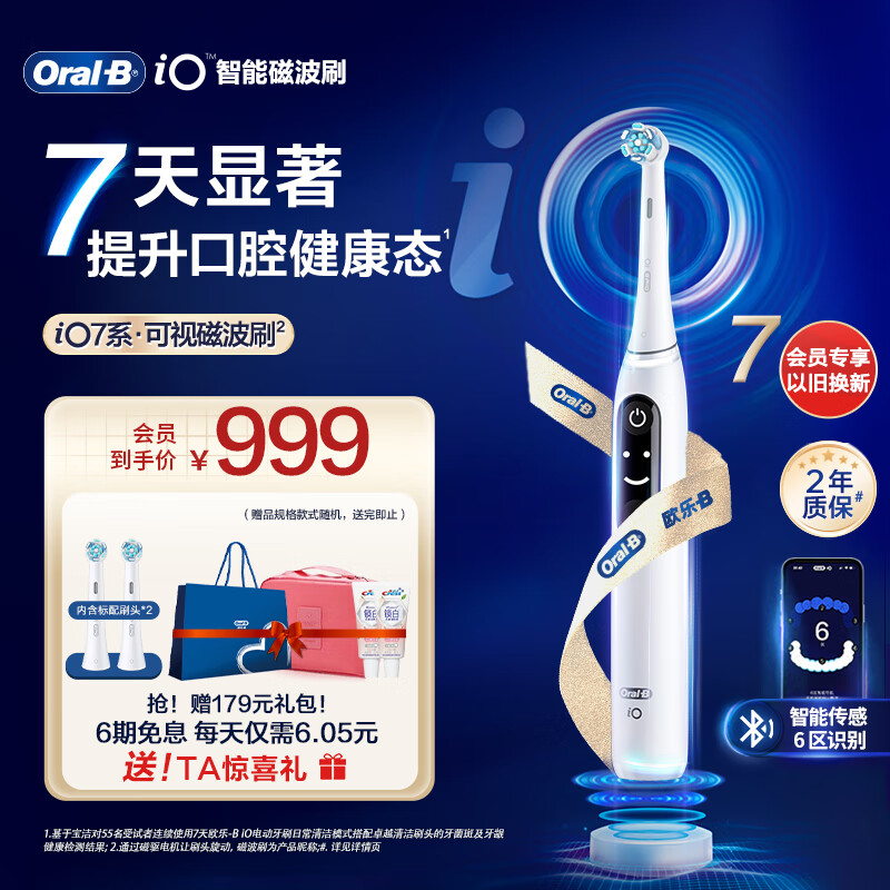 欧乐B成人电动牙刷iO7智能可视磁波刷iO系列圆头微震科技深度清洁牙龈按摩送礼送男友送女友母亲节礼物价格:998.90元!