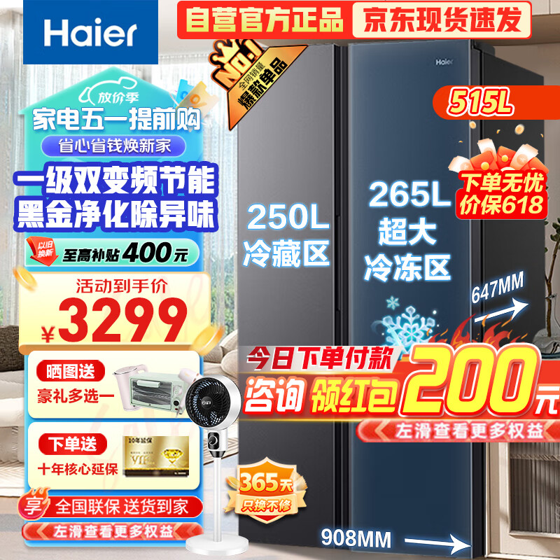 海尔(Haier)515升对开门双开门电冰箱超大冷冻空间大容量 一级能效变频风冷无霜黑金净化超薄价格:3298.00元!