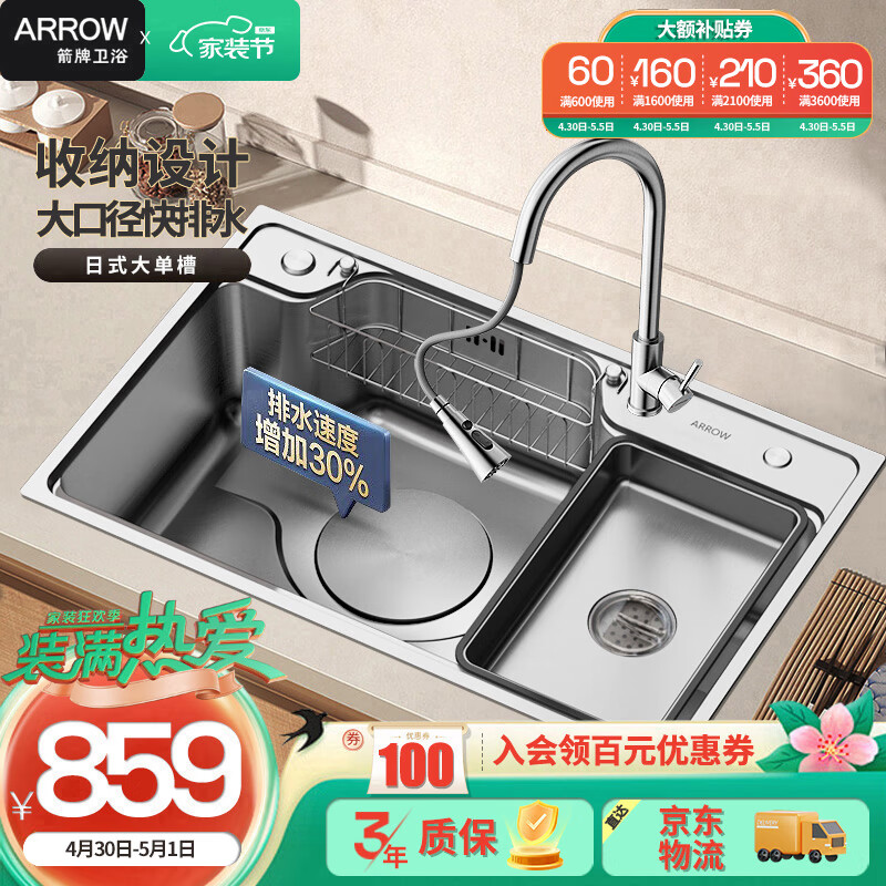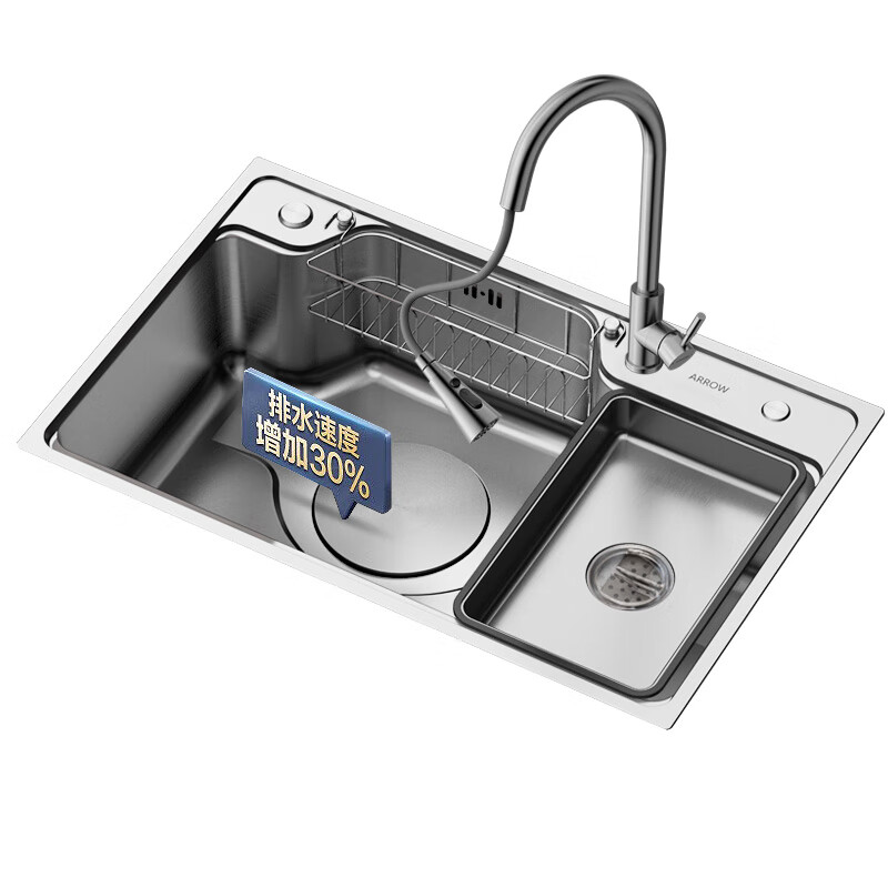 箭牌(ARROW)水槽厨房洗菜盆不锈钢家用日式大单槽AE5575417G21-SS·75*48价格:919.00元!