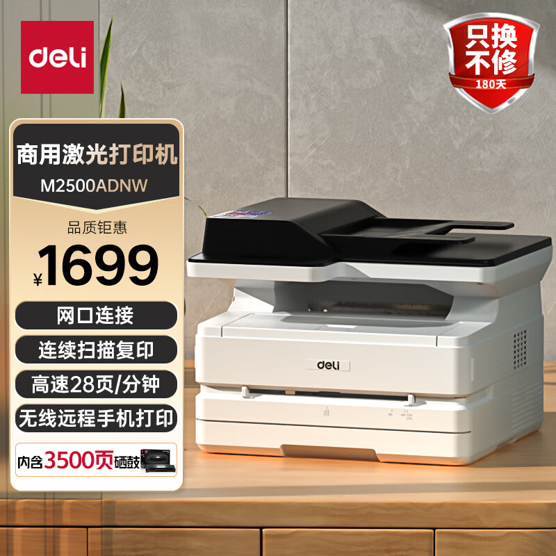 得力(deli)M2500ADNW黑白办公商用三合一A4打印机复印机扫描机多功能一体机 家用无线 自动双面激光打印机价格:1699.00元!
