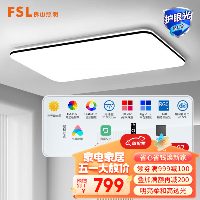 FSL佛山照明全光谱护眼吸顶灯高亮米家客厅灯豁免级蓝光Ra97悦夕190W价格:1099.00元!