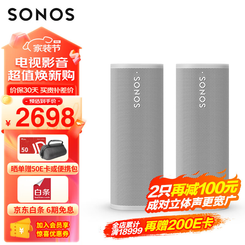 SonOS Roam SLx2 便携式 WIFI无线 蓝牙音响 成对立体声 户外露营 超长续航 家庭影院 防水防尘(白色)价格:2698.00元!