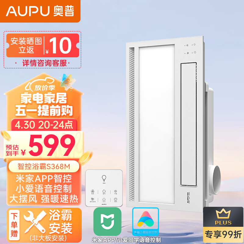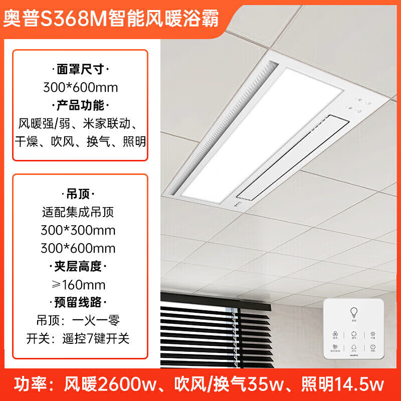 奥普(AUPU)浴霸S368M风暖浴霸 大摆页强弱两档暖风 柔光照明 已接入米家价格:1049.00元!