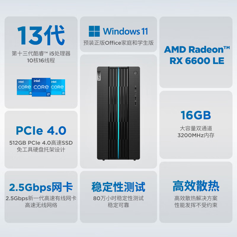 联想(Lenovo)GeekPro 设计师游戏台式电脑主机(酷睿13代i5-13400F RX6600LE 8GB显卡 16G 512G SSD )价格:4799.00元!