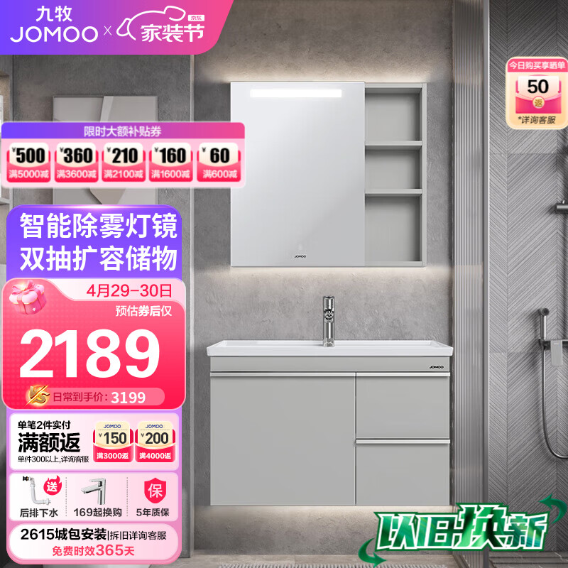 九牧(JOMOO)极简美妆智能镜浴室柜陶瓷一体洗脸盆柜组合80cm A2704-117Y-3价格:2849.00元!