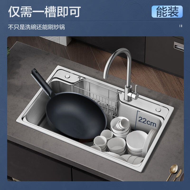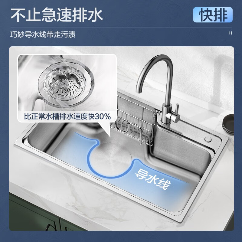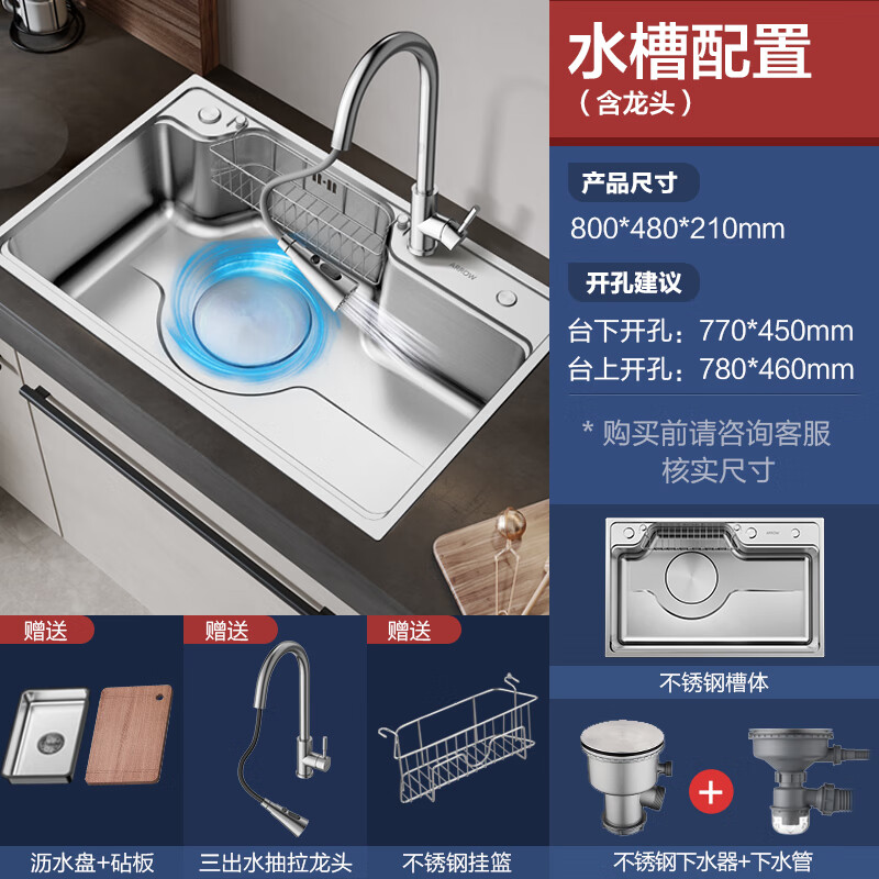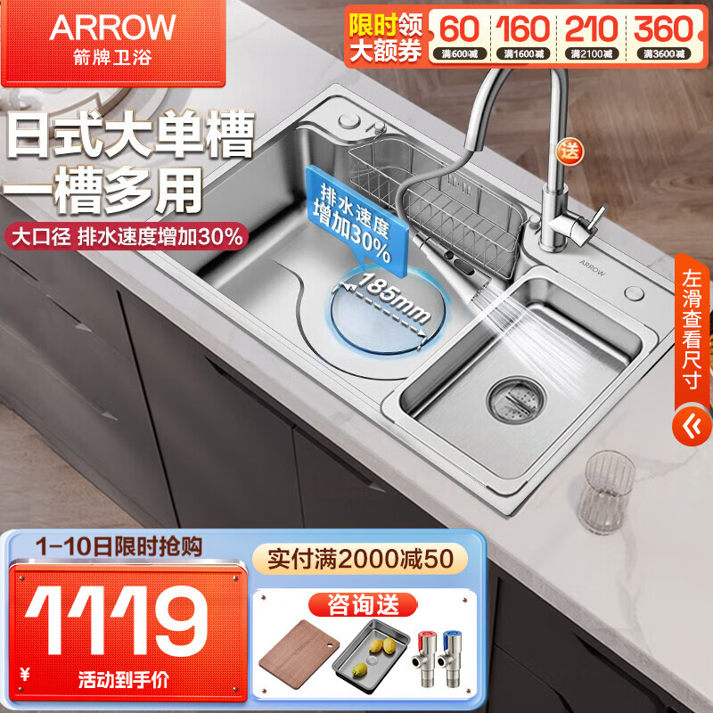 箭牌(ARROW)304不锈钢水槽 日式大口径单槽厨房洗菜盆台上盆大单槽 80*48超大口径单槽+冷热抽拉龙头价格:1319.00元!
