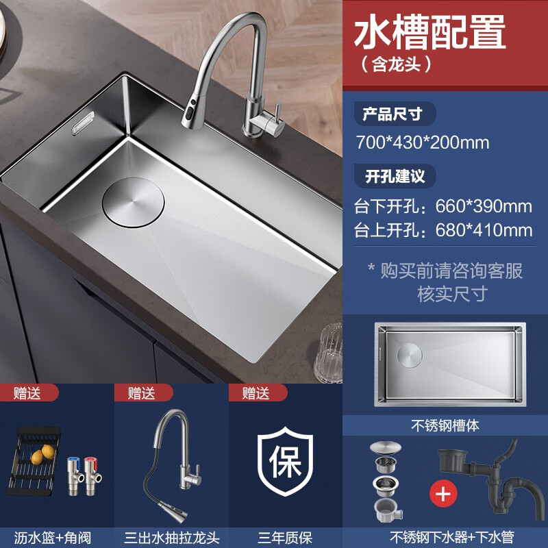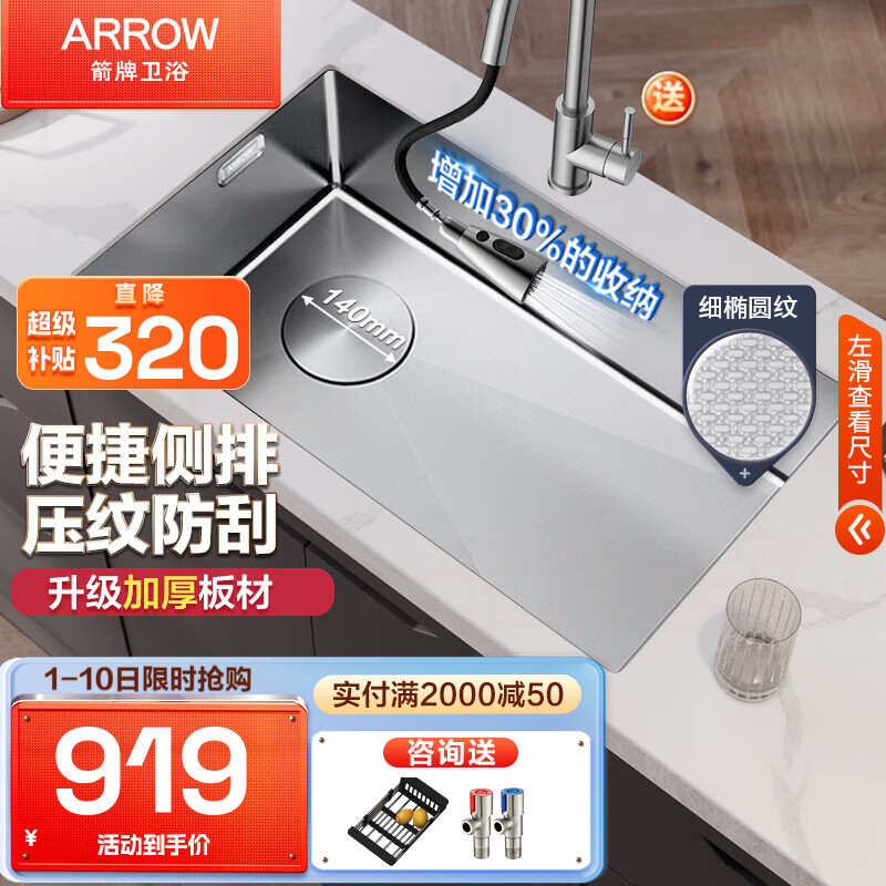 箭牌(ARROW) 304不锈钢厨房手工水槽大单槽洗菜盆洗碗池盆茶水间台上台下盆 70*43侧排手工压纹+冷热抽拉龙头价格:919.00元!