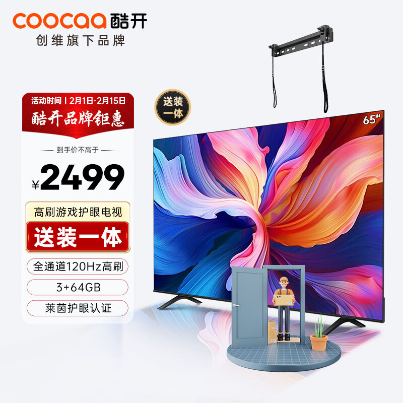 酷开创维K3 Pro 65英寸电视 送装一体 120Hz高刷 3+64G 4K护眼 声控投屏液晶平板游戏电视机65P3D Max价格:2499.00元!
