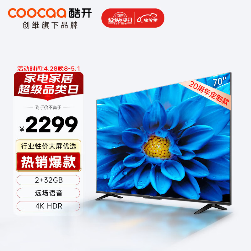 酷开创维J3 70英寸电视 4K超清 2+32G大内存 远场语音声控 无频闪 金属屏 平板电视机以旧换新70J3价格:2299.00元!