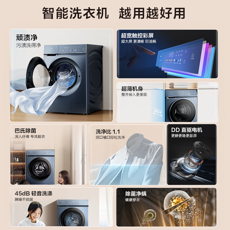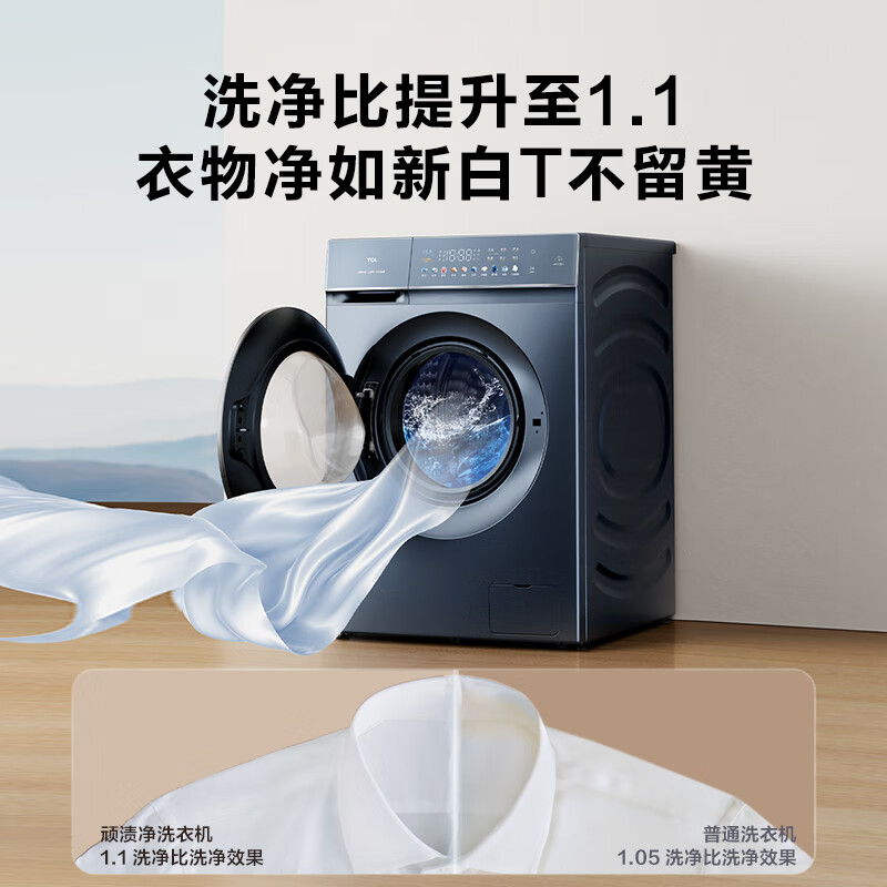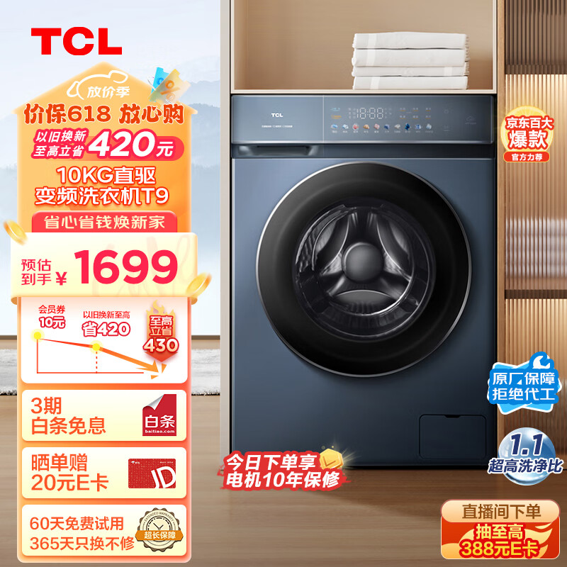 TCL 10KG直驱变频滚筒全自动洗衣机T9 除菌除螨 洗净比1.1 超宽彩屏 超薄嵌入 G100T9-D价格:1699.00元!