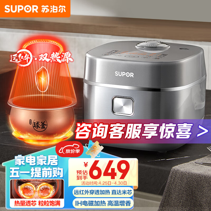 苏泊尔(SUPOR)电饭煲 电饭锅 家用4L大容量 柴火饭 煲仔饭 智能预约 远红外穿透 IH电磁加热 SF40HC0968价格:649.00元!